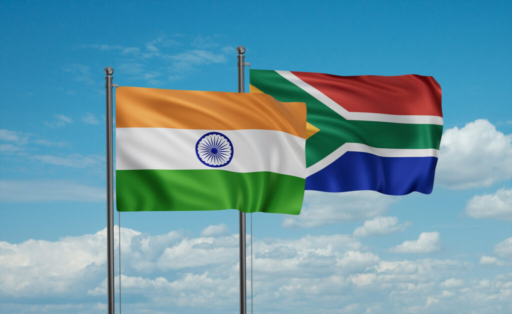 Republic of South Africa and India flag waving together in the wind on blue sky, two country cooperation concept