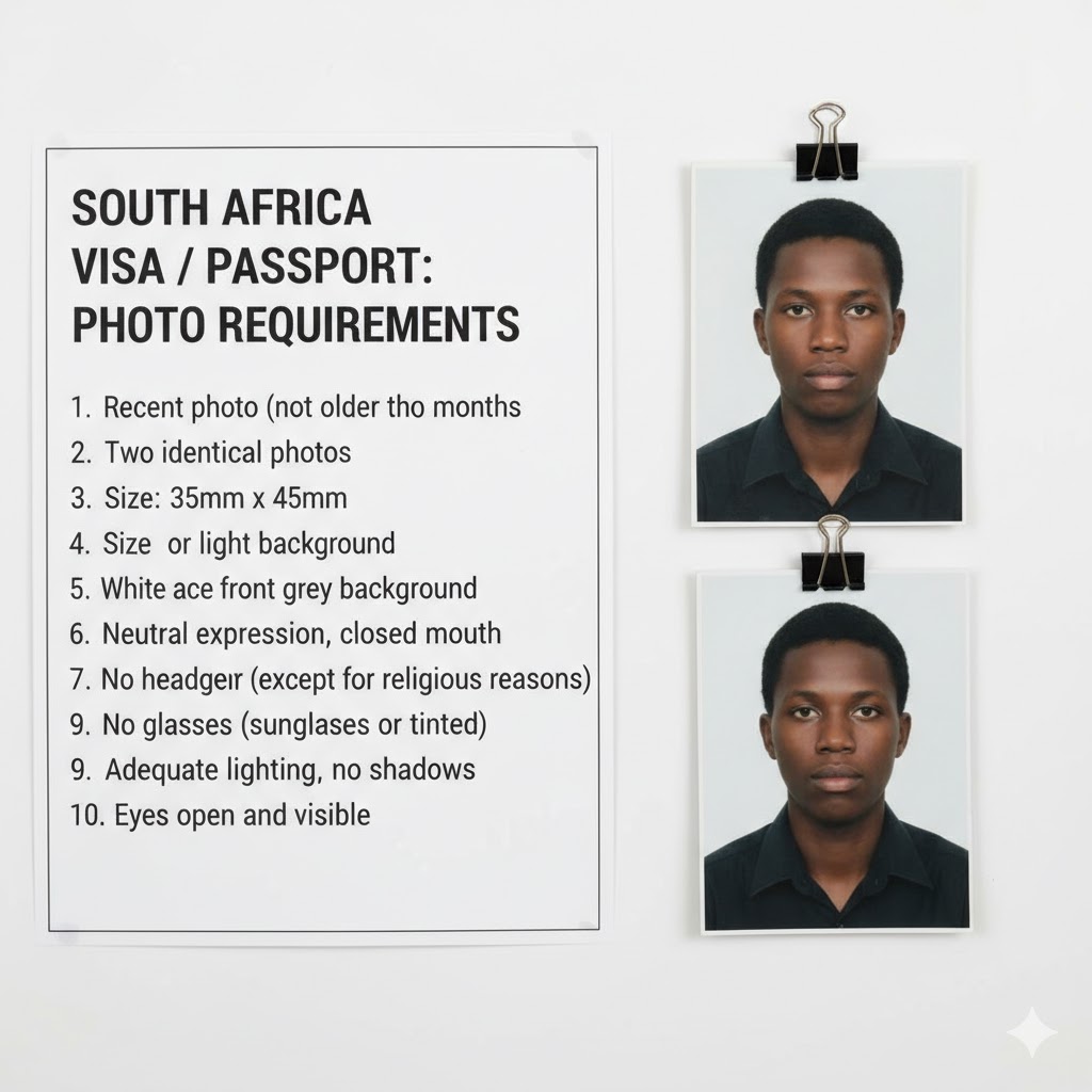 Don’t let a bad photo get your application rejected. The system uses biometric scanners, so the rules are strict for South Africa visa photo requirements :-