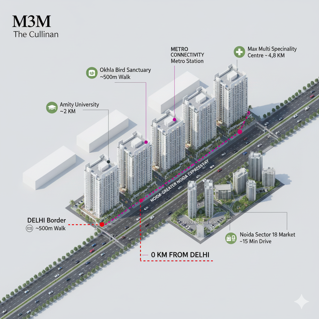 M3M The Cullinan is positioned as an ultra-luxury, mixed-use development, inspired by the world-famous Cullinan diamonds. It is designed to offer expansive residences and high-street commercial spaces.