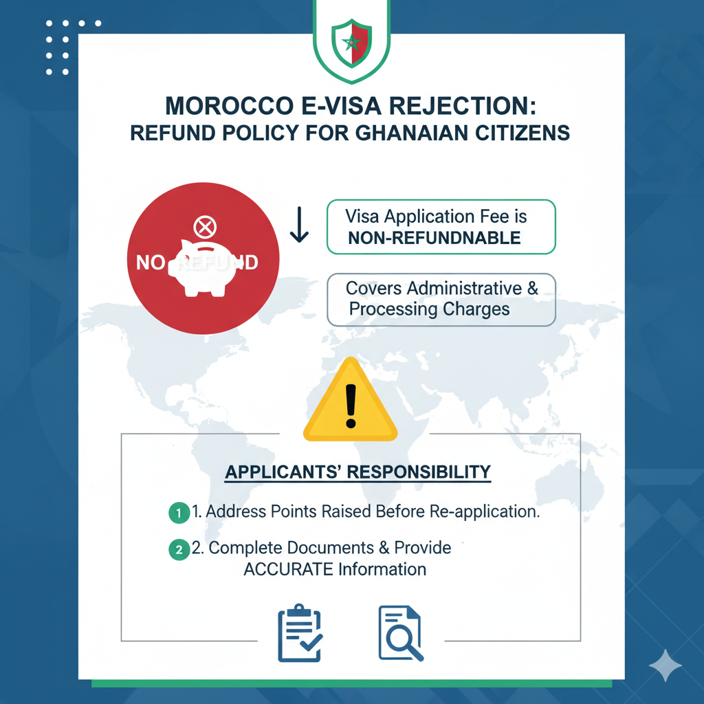 When a Moroccan e-visa for Ghanaian citizens is turned down, the visa application fee is not refundable. This is because the fee covers administrative and processing charges incurred during the evaluation.