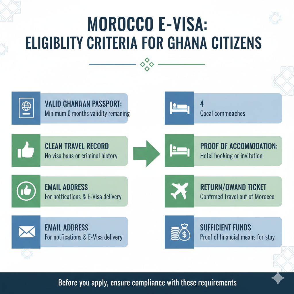 Before starting the application process, Ghanaian travelers need to first ensure that they are eligible for a Morocco E-Visa, which means they have to comply with the following criteria: