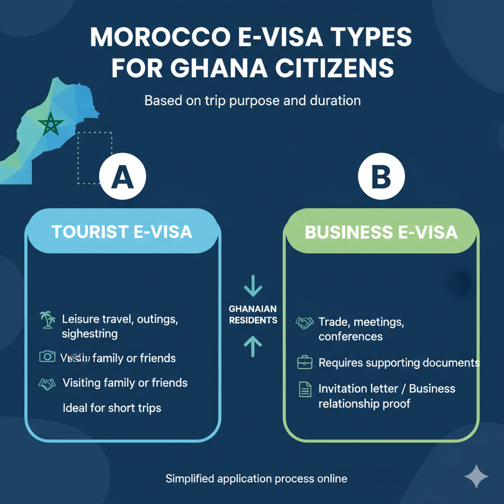 As per the purpose and length of a trip, Ghanaian residents are allowed to take advantage of the following varieties of Moroccan e-visa: