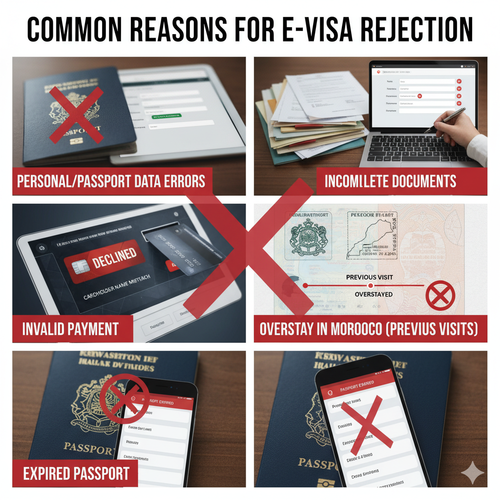 Some of the rejection reasons include personal or passport data errors, not fully completed documents, and invalid payment with a mismatched cardholder name. Furthermore, there is also overstaying in Morocco on previous visits and applying with an expired passport.