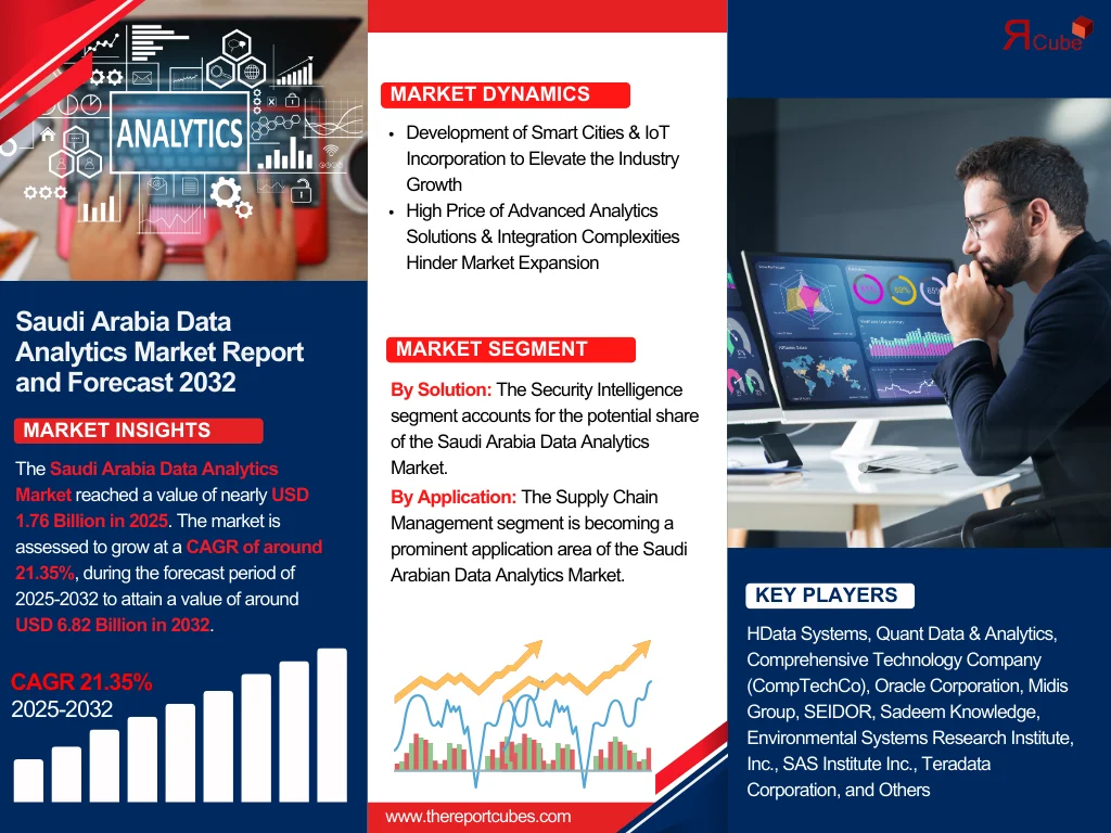 According to The Report Cube study the Saudi Arabia Data Analytics Market reached a value of nearly USD 1.76 Billion in 2025. The market is assessed to grow at a CAGR of around 21.35%, during the forecast period of 2025-2032 to attain a value of around USD 6.82 Billion in 2032. The rising usage of big data solutions, AI (artificial intelligence), cloud computing, business intelligence (BI), and predictive analytics across trades is fueling the Saudi Arabia Data Analytics Market’s tremendous expansion. Healthcare, manufacturing, finance, and retail are among the sectors deploying advanced analytics tools to enhance decision-making, operational efficacy, and consumer experience owing to the Saudi Government’s Vision 2030 priority on digital revolution. Also, the market is expanding, owing to the mounting requirement for enterprise data management solutions, AI-powered insights, and real-time data processing. Moreover, investments in ML, data-driven governance, and Internet of Things (IoT) analytics are transforming the way public & private entities manage data or information.