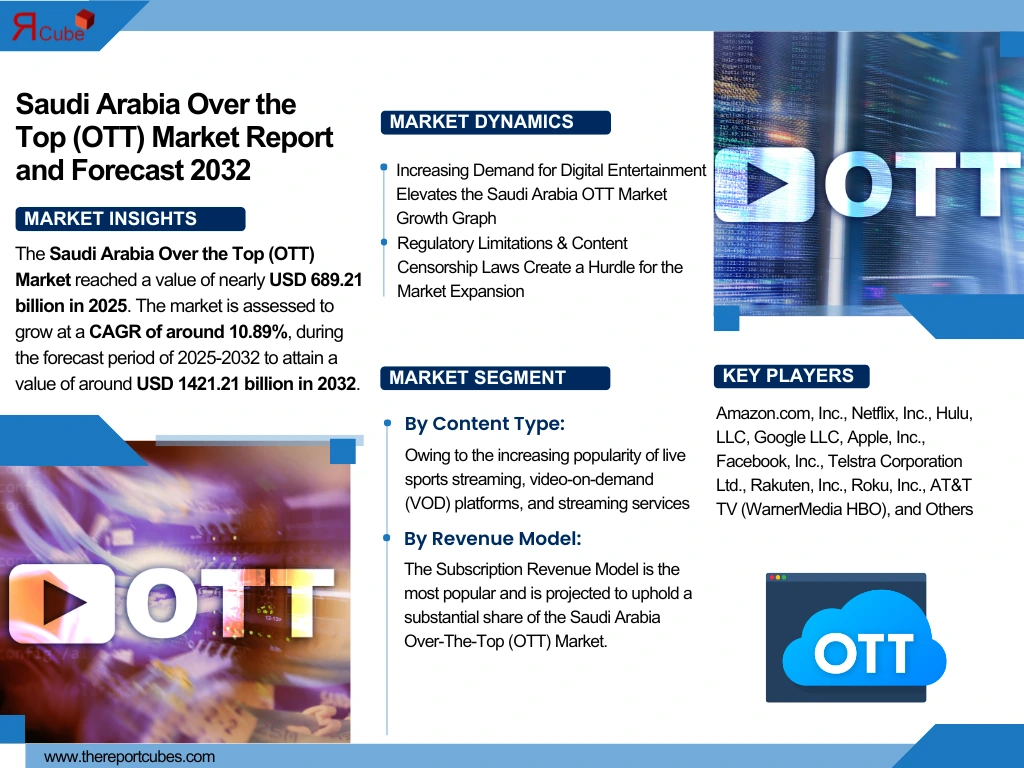 According to The Report Cube study the Saudi Arabia Over the Top (OTT) Market  reached a value of nearly USD 689.21 billion in 2025. The market is assessed to grow at a CAGR of around 10.89%, during the forecast period of 2025-2032 to attain a value of around USD 1421.21 billion in 2032. The market is developing swiftly owing to Vision 2030’s digital transformation objectives, mounting internet penetration, and smartphone adoption. The nature of entertainment has transformed in line with the expansion of live-streaming services, advertising-based video-on-demand (AVOD), and subscription-based video-on-demand (SVOD). Large enterprises, such as Netflix, StarzPlay, Shahid, Amazon Prime Video, and OSN+ are increasing their footprint in the country by offering premium & locally relevant content. Also, the user experience has been enhanced with the launch of 5G & advancements in cloud-based streaming, which have largely improved content delivery networks (CDNs). The Saudi Arabia Over-the-Top (OTT) Market is progressing in Saudi Arabia due to the nation’s youthful, tech-savvy population & escalating demand for personalized video content.
