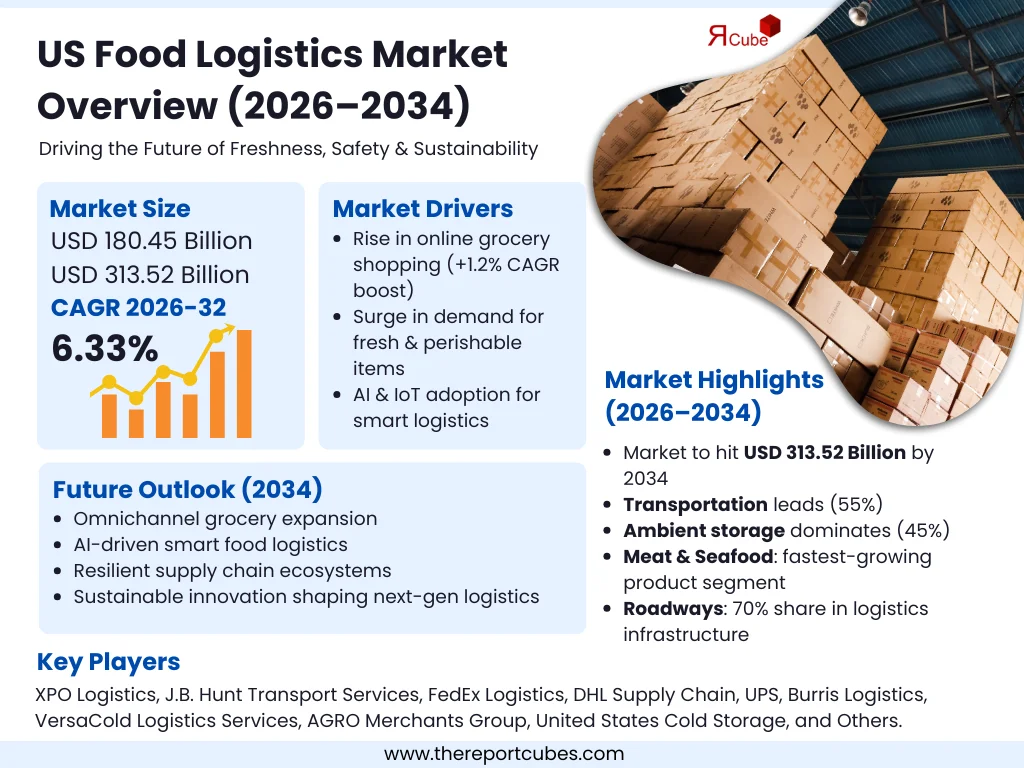 According to The Report Cube study the US Food Logistics Market is anticipated to register a CAGR of around 6.33% during the forecast period, 2026-34. Additionally, the market size was valued at nearly USD 180.45 billion in 2025 and is projected to reach almost USD 313.52 billion by 2034.